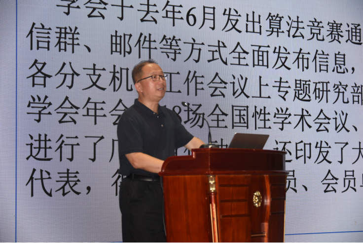 (上图为中国密码学会秘书长安晓龙作报告:《算法竞赛基本情况介绍》)