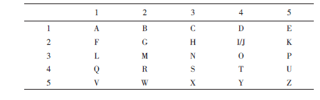 公元前2世纪,一个叫Polybius的希腊人设计了一种将字母编码成符号对的方法,他使用了一个称为Polybius的校验表,这个表中包含许多后来在加密系统中非常常见的成分。Polybius校验表由一个5行5列的网格组成,网格中包含26个英文字母,其中I和J在同一格中。相应字母用数对表示。在古代,这种棋盘密码被广泛使用。Polybius校验表如表2所示。